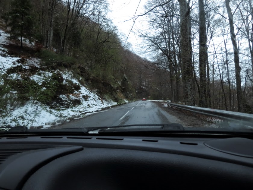 車は、なだらかな丘陵地帯を延々と走り続け、その突き当たりに屏風のようにそびえ立つ急峻な山道を駆け上る。