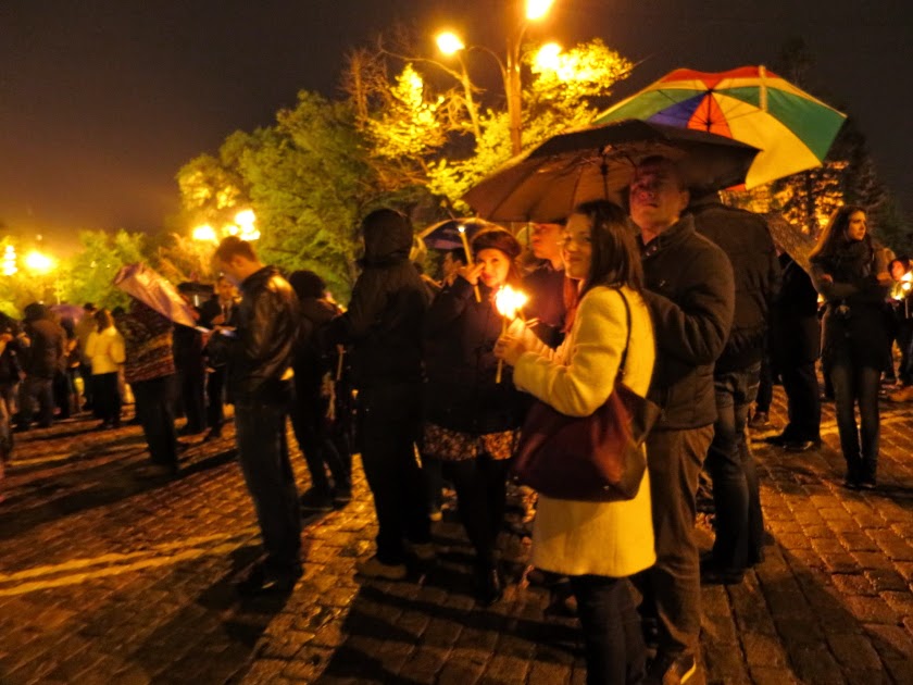 聖堂の正面広場に回ると、中に入れなかった大勢の人々が、スピーカーから流れる祈りを聞き、ロウソクの火を分かち合っていた。